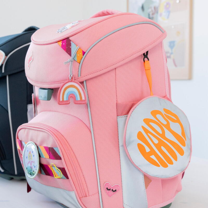 Schulranzen, Turnbeutel, Federmäppchen mit Eberhard Faber Stiften, Schlampermäppchen (auch Stiftehalter), Brustbeutel mit Schlüsselfinder, Regenhülle im Deckel, Patches & Anhänger