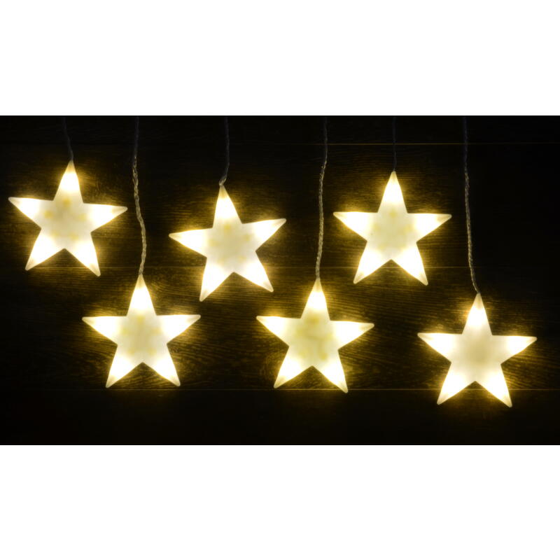 Diese 6 beleuchteten LED-Kunststoffsterne mit je 5 Zacken schaffen eine weihnachtliche Atmosphäre und bringen eine wunderbare warme Ausstrahlung und Gemütlichkeit in die Winterzeit. 5 warmweiße Lichter sind in jedem Stern in den Spitzen fest integriert. Die Größe der Sterne im Durchmesser beträgt je 15 cm mit einer Stärke von ca. 2 cm. Die 1,5 Meter lange Lichterkette ist für den Innenraum geeignet und mit transparentem Kabel ausgestattet. Der Abstand zwischen den Sternen beträgt 30 cm, die Zuleitung beträgt noch 3 weitere Meter. Die Lämpchen sind nicht auswechselbar, geringer Energieverbrauch.