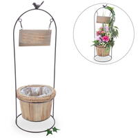 Dieses dekorative Metallgestell mit integriertem Pflanztopf eignet sich ideal für den Eingangsbereich und setzt einen einladenden Akzent. Der braune Metallrahmen trägt einen Pflanztopf in Holzoptik, der durch eine umlaufende Kordel ergänzt wird. Oberhalb des Topfes hängt ein Holzschild mit dem Schriftzug "Willkommen", das den freundlichen Charakter des Arrangements unterstreicht.
