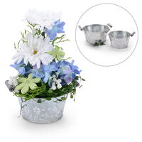 Erhältlich in zwei Größen - Ø 15 x H 8 cm und Ø 18 x H 9 cm - eignet sich die Pflanzwanne optimal für kleinere Blumenarrangements, Kräuter oder saisonale Dekorationen. Dank der silberfarbenen Oberfläche mit weißen Details passt sie sowohl in moderne als auch in rustikale Einrichtungsstile und ergänzt stilvoll jede Frühlings- oder Sommerdeko.