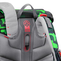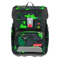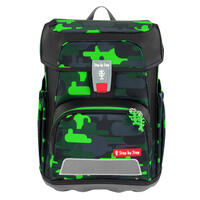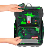 Zur Ausstattung gehören: Anhebe-/Aufhängeschlaufe, Federmäppchen-Halterung im Deckel, gepolsterter Tragegriff, isolierte Fronttasche, Magnetverschluss, Platz für DIN-A4 Ordner, stabile, standfeste Bodenplatte, Stundenplanfach mit integriertem Stundenplan im Deckel und zwei verschließbare Seitentaschen.