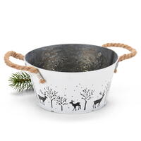 Der Zinktopf "Winter" ist ein vielseitiges Dekorationselement für die kalte Jahreszeit. In seiner praktischen Größen von Ø 20 x H 10 cm, bietet er Platz für kreative Arrangements. Die antikweiße Lackierung mit stimmungsvollem Waldaufdruck und die zwei Jutegriffe verleihen dem Topf einen natürlichen Look.